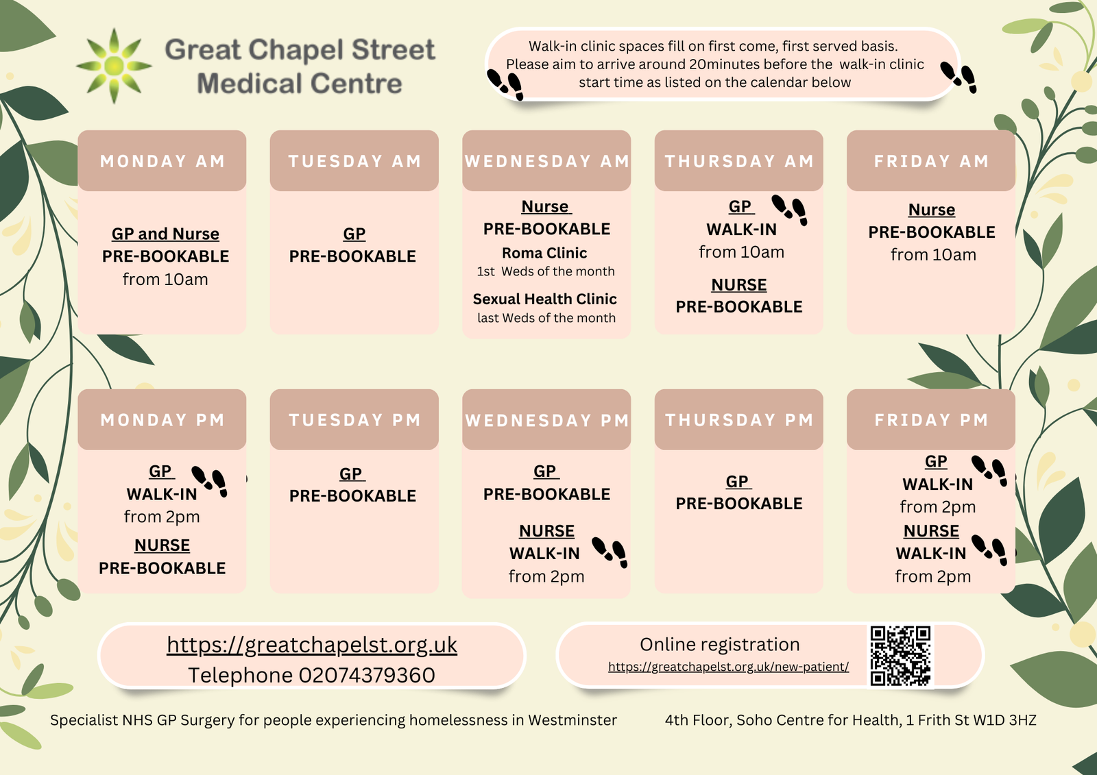We have a range of pre-bookable or walk in clinics throughout the week. More details are provided below.